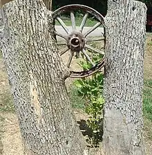 A wagon wheel grown into the V of a deceased Ash tree, near the boat launch on Long Lake (2012).
