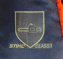In the EU, chainsaw trousers, boots, and gloves (the items containing chainsaw protective fabric) must carry a special chainsaw logo.[2] This shows that the fabric is of a type tested to protect properly, and also shows the class of protection, the rated maximum chain speed.