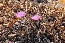 Chamaeleon gummifer, also known as distaff thistle or stemless atractylis, is a thistle in the Chamaeleon genus. Formerly, it was placed in the Atractylis genus.[1] It is native to the Mediterranean basin, where it can be found in various habitats, including cultivated- or uncultivated fields and forests.[3][1] It is a perennial herb producing a stemless, pinkish flower. The plant has a history of use in folk medicine, but it is very toxic due to the presence of atractyloside and carboxyatractyloside.[4]