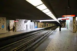 One of the most important artworks in the Metro, a set of stained glass windows by noted Quebec artist Marcelle Ferron, illuminates the mezzanine of this station. These windows, one of the artist's masterpieces and her most famous work, were given by the Government of Quebec in 1968. They were the first work of non-figurative art to be commissioned for the Metro, representing the first official entrance of Automatist art in the system.