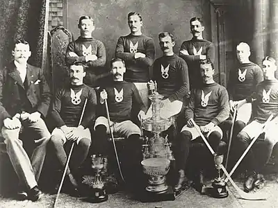 The Montreal Hockey Club ordered the first championship rings for its players after winning the 1893 Stanley Cup championship, ordering rings resembling wedding bands with two crossed hockey sticks.[20] Although several NHL teams ordered championship rings in the early 20th century,[21] Stanley Cup-winning teams ordering championship rings did not become an annual custom in the NHL until the 1960s.[20]