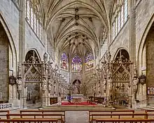 In churches with a traditional Latin cross plan, and a transept and central crossing, the chancel usually begins at the eastern side of the central crossing, often under an extra-large chancel arch supporting the crossing and the roof. This is an arch which separates the chancel from the nave and transept of a church.[4] If the chancel, strictly defined as choir and sanctuary, does not fill the full width of a medieval church, there will usually be some form of low wall or screen at its sides, demarcating it from the ambulatory or parallel side chapels.
