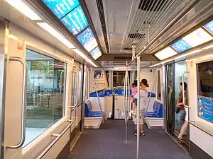 ![]() Interior of the Skytrain Crystal Mover on PMS/North; trains on PMS/South feature orange seats | |