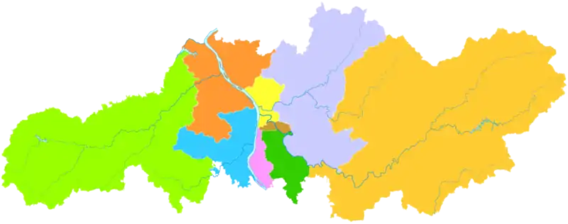 Most of the rivers in Changsha belong to the Xiang River system. In addition to the Xiangjiang River, 15 tributaries flow into the Xiang, mainly including Liuyang River, Laodao River, Minjiang River, and Qinshui River.[52] 302 tributaries are more than five kilometers long, including 289 in the Xiang River Basin. According to the tributary grading there are 24 primary tributaries, 128 secondary tributaries, 118 third tributaries, and 32 tributaries; and 13 are Zijiang water systems; a fairly complete water system is formed, and the river network is densely distributed. Hydrological characteristics of Changsha: the water system is complete, the river network dense; the water volume greater, the water energy resources abundant; the winter not frozen, and the sediment content small.[53]