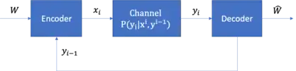 That is, for each time there exists a feedback of the previous output such that the encoder has access to all previous outputs . An code is a pair of encoding and decoding mappings with , and is uniformly distributed. A rate is said to be achievable if there exists a sequence of codes such that the average probability of error: tends to zero as .
