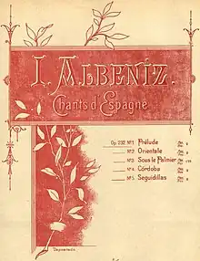 Chants d'Espagne, Op. 232, (Spanish: Cantos de España, English: Songs of Spain) is a suite of originally three, later five pieces for the piano by Isaac Albéniz. Prélude (later known as Asturias (Leyenda)), Orientale and Sous le palmier were published in 1892, and Córdoba and Seguidillas were added in the 1898 edition. According to Günter Schulze, "Many...[of the works] have the flavor of the flamenco so beloved of Albéniz."[1]