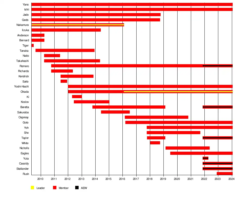 Since its founding, Chaos has added several new members, including Kazuchika Okada, who has held the IWGP Heavyweight Championship five times and won the G1 Climax tournament in 2012, 2014 and 2021, as well as the 2013 and 2019 New Japan Cup. Okada became the leader of Chaos after Nakamura's departure from New Japan and succeeded Hiroshi Tanahashi as the promotion's "ace," or top star. Rocky Romero, another member of Chaos, won the IWGP Junior Heavyweight Tag Team Championship a record eight times.