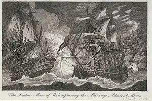 On the return journey to France, Marengo and Belle Poule encountered a large British squadron under Admiral Warren off Cape Verde.[21] In the action of 13 March 1806, the 90-gun HMS London, the 80-gun HMS Foudroyant and the 38-gun frigate HMS Amazon, were sailing some miles ahead of their compatriots when, at 03:00, Linois' ships were spotted. The three British ships immediately gave chase and by 05:30, London had overhauled and begun an exchange with both French ships. By 06:00 Linois realised that he was unable to win the battle and attempted to move off, issuing orders for Belle Poule to do likewise.[22]