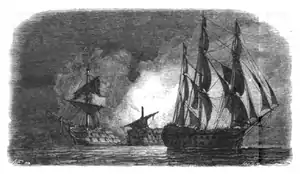 While acting as a decoy for an important convoy of wheat from the United States, Linois was captured by the Royal Navy at the action of 7 May 1794.[4] On 5 May, Atalante, in company with the corvette Levrette, encountered a British convoy three days out from Cork. The convoy was under the protection of two ships of the line, the 74 HMS Swiftsure and the 64-gun HMS St Albans, which immediately hoisted their colours and opened fire.[5] Linois realising he was outgunned, as senior officer, ordered his ships to divide and effect an escape. Levrette; managed to evade her pursuer, St Albans during the night but Atalante was unable to shake off Swiftsure which continued her chase throughout the following day. By 0325 on 7 May, Atalante had been overhauled and so badly damaged during the two-day running battle, Linois was forced to surrender. He and his crew were taken prisoner and Atalante was eventually taken into the Royal Navy as HMS Espion[6][7]