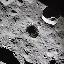 The Apollo 16 Command and Service Module (CSM), as seen from the Lunar Module (LM, out of view) above terrain on the lunar farside.