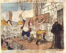![]() An 1813 fanciful illustration of Hamilton being whipped, wearing male boots and breeches, but naked from the waist up | |