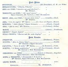 - ↑ Signor Campobello was the stage name of Henry McLean Martin, baritone. According to Groves' Dictionary 1890 edition, in 1874 he married the soprano Clarice Sinico, née Marini, afterwards known as Mme Sinico-Campobello.