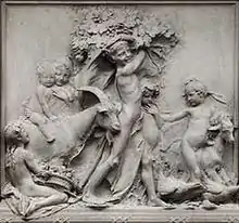 The walls of the main hall are covered with red Italian brocade (woven fabric) and with pilasters and cove (concave-profile) moldings of carved American walnut. Over the mantle of the marble fireplace in the main hall is a six-foot marble relief, weighing two tons, called "Life" by Karl Bitter. The relief won the gold medal at the Saint Louis Exposition, 1904 and is placed on a foundation extending to the cellar.[3]