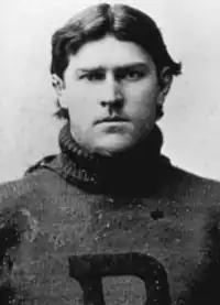 While at Penn, Wharton played college football at the guard position for the Penn Quakers football teams from 1893 to 1896. During his time with the Quakers, they compiled a 34-game winning streak, including perfect seasons in 1894 (12–0) and 1895 (14–0) and back-to-back national championships.[3] He was captain of the 1896 team that compiled a 14–1 record. Wharton received first-team All-America honors for three consecutive years, being recognized as an All-American in 1894 by Leslie's Weekly,[4] in 1895 by Walter Camp and Caspar Whitney,[5] and again in 1896 by Walter Camp.[5]