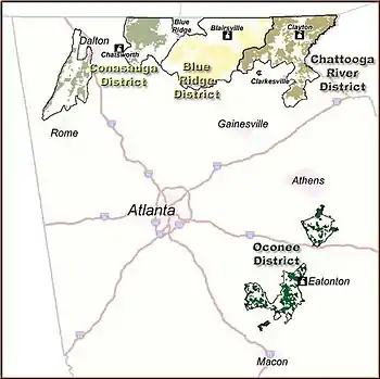 The Chattahoochee National Forest today covers 18 north Georgia counties. The Chattahoochee currently has three ranger districts: