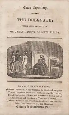 The individual tracts have a complex bibliographical history often going through many editions and involving several different individuals who were designated 'Printer to the Cheap Repository,' together with many distributors and publishers. Retail sales were made by 'booksellers, newsmen, and hawkers, in town and country.'[7] The most important printers involved were Samuel Hazard of Bath; John Marshall of London, William Watson of Dublin; and John Evans of 42 Long Lane, London. Several copies were also reprinted in the U.S.A. by printers in both New York and Philadelphia. Until the end of 1798 the publisher undertaking the work was 'The Cheap Repository', but thereafter the copyrights of the official tracts were sold and later collected editions were published by John and James Rivington for the Society for Promoting Christian Knowledge (S.P.C.K.)