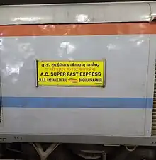 The Chennai Central–Bodinayakanur AC Superfast Express is a AC Superfast express train connecting Chennai and Bodinayakanur which lies in Southern Railway zone of Tamil Nadu State in India. This train has been extended upto Bodinayakanur via Teni after the gauge conversion of this route was completed. From 15, June 2023 it made its first run from Bodinayakanur to Chennai.[1]