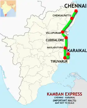 The Chennai Egmore–Karaikal Kamban Express is an Express train belonging to Southern Railway zone that runs between Chennai Egmore and Karaikal in India. It is currently being operated with 16175/16176 train numbers on a daily basis.[1][2][3]