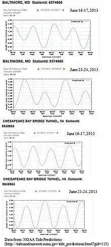 Example Chesapeake Bay tides from Baltimore and the Chesapeake Bay Bridge–Tunnel for quarter and full moons during June 2013