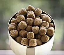 Dry dog food usually consists of bagged pellets that contain 3-11% water.[20] It makes up the vast majority of pet foods.[21]