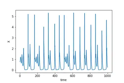 in which, is called activation or action potential variable, and is the recovery variable. The model has four parameters, is a time-dependent additive perturbation or a constant bias, is the time constant of recovery , is the activation-dependence of the recovery process and is an offset constant. The model has a rich dynamics, presenting from oscillatory  to chaotic behavior,[4][5] as well as non trivial responses to small stochastic fluctuations.[6][7]