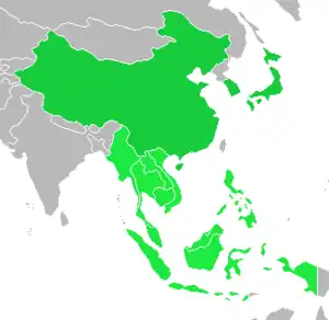 Participants of the Chiang Mai Initiative: regular ASEAN states marked light green; Plus Three states marked green