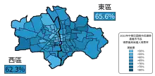 Chiayi City voted one Democratic Progressive Party legislator to be in the Legislative Yuan during the 2020 Taiwanese legislative election. It has historically been a very pan-Green city. During the martial law era, most people of Chiayi supported tangwai politicians. However, the voting gap between the DPP and the KMT has narrowed in recent years.[21] And in 2022 Taiwanese local elections, Chiayi City re-elected Huang Min-hui of Kuomintang to be the mayor.