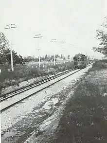 Despite a malfunctioning power system, a group of nearly-untrained motormen, and only six pieces of operational rolling stock, the Aurora branch of the Chicago Aurora and Elgin Railroad opened on August 25, 1902. Fares were 25 cents one-way and 45 cents round-trip. Passengers who wanted to enter The Loop had to transfer to the Metropolitan West Side Elevated at 52nd Avenue for an additional five cents. Service began at 5:33am and concluded at 11:33pm, with trains running every thirty minutes. Terminals were opened to the public at 52nd Avenue, Austin Avenue (in Chicago), Oak Park, Harlem Avenue (in Forest Park), Maywood, Bellwood, Wolf Road (in Hillside), South Elmhurst, Secker Road (in Villa Park), Lombard, Glen Ellyn, College Avenue (in Wheaton), Wheaton, Gary Road (in Wheaton), Chicago Golf Grounds, Warrenville, Ferry Road (in Warrenville), Eola Junction (in Aurora), and Aurora.[15][16] A one-way trip from Aurora to Chicago was seventy-five minutes. The final four cars from the Niles Car Company arrived on September 5 and were put into service seven days later. The original train schedules posted at stations showed service on the Batavia branch. However, actual service did not begin until the last week of September 1902. The Batavia branch met the Aurora branch at Eola Junction. Even when opened, the Batavia branch experienced little traffic and may have been primarily used as convenient transport for railroad officials to the Batavia powerhouse.[17][18]
