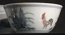 A Chicken Cup is a bowl-shaped vessel made of Chinese porcelain painted in the doucai technique. Chicken cups were created during the Ming dynasty (1368 – 1644), during the Chenghua Emperor's reign (1465 – 1487) in China, and originally functioned as a vessel to drink wine from. Chenghua Chicken Cups were created in an imperial kiln in the Jingdezhen porcelain factory, in Southern China.[1] The Emperor Chenghua had the Chicken Cup created in the 15th century as an act of devotion for his empress mother who was recorded to have an appreciation for small objects and valued a simple design taste.[2]
