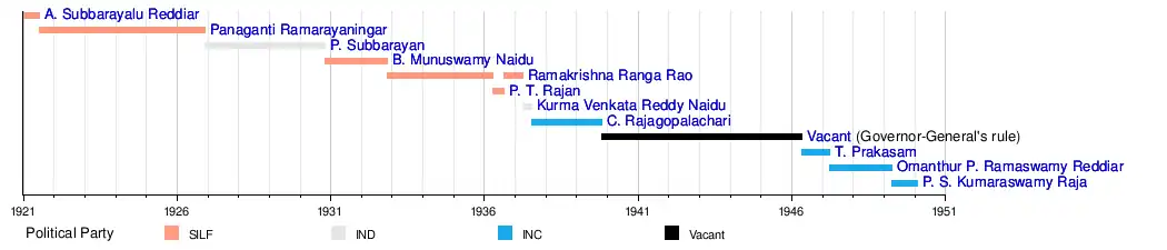 Leader of the Presidency Legislative Council | 14 July 1937 | 29 October 1939[RES] | 2 years, 107 days | Rajagopalachari I | Indian National Congress | |||