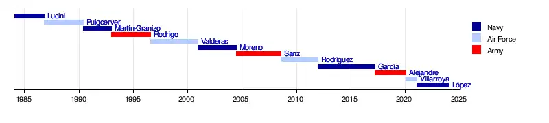 | 12 | Admiral General Teodoro Esteban López Calderón (born 1954) | 27 January 2021 | Incumbent | 2 years, 354 days | ![]() Navy | Felipe VI | [32] |