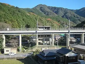 The station, which is unstaffed, consists of a side platform serving a single elevated track. From the main road, a flight of steps leads to a dias. A tall stairwell then gives access to the platform. An automatic ticket vending machine is located at the base of the stairwell. A toilet building is located next to the dias.[2][3][4]