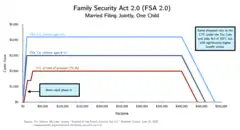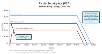On June 15, 2022, Senator Mitt Romney, along with Senators Richard Burr and Steve Daines, introduced the Family Security Act 2.0 (FSA 2.0), a modification of Romney's earlier plan.[63] Like his earlier plan, the FSA 2.0 would substantially raise the child benefit relative to the existing child tax credit.[64] However, the FSA 2.0 includes a $10,000 income phase-in (i.e. a family must make at least $10,000 to qualify for the full benefit) and retains the substantial reductions to the earned income tax credit from his earlier plan, which would result in many low and moderate income single families seeing their combined benefits cut under the plan.[65]
