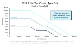 The child tax credit has been criticized for its complexity. In many countries, a simple monthly child allowance is sent to all families.[71] In the United States, by contrast, the CTC has a complicated structure: it includes an income threshold, a phase-in formula, a separate phase-out formula, and mixes reduction of tax liability with direct payments. The 2021 expansion scrapped the income threshold and phase-in, but has a more complicated phase-out structure: it first phases down to a $2,000 plateau and then at higher incomes phases down to $0; the phase-out structure also differs depending on the number of qualifying children (see chart).[55][72]