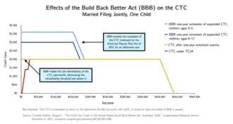 The Build Back Better Act, passed by the House of Representatives on November 19, 2021,[61] would extend the expansion of the CTC made by the American Rescue Plan Act of 2021 for one year.[62] Significantly, it would also make the full-refundability of the CTC permanent (i.e. it would permanently eliminate the earned income threshold and phase-in, so that low-income families can access the full value of the credit).[18] The bill stalled in the Senate and was ultimately replaced by the Inflation Reduction Act of 2022, which did not include an expansion to the child tax credit.