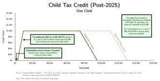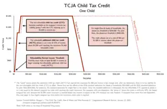 The United States federal child tax credit (CTC) is a partially-refundable[lower-alpha 1] tax credit for parents with dependent children. It provides $2,000 in tax relief per qualifying child, with up to $1,400 of that refundable (subject to a refundability threshold, phase-in and phase-out[lower-alpha 2]). In 2021, following the passage of the American Rescue Plan Act of 2021, it was temporarily raised to $3,600 per child under the age of 6 and $3,000 per child between the ages of 6 and 17; it was also made fully-refundable[lower-alpha 3] and half was paid out as monthly benefits. This reverted back to the previous in 2022. The CTC is scheduled to revert to a $1,000 credit after 2025.