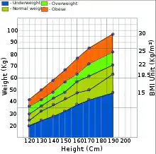 Body Mass Index (BMI) is a common and useful measurement of body fat that helps individuals understand the difference between being overweight and obese. The system can be used to calculate a person's Body Mass Index (BMI) by dividing their weight (in kilograms) by the square of their height (in meters).[3] According to the World Health Organisation (2015) a BMI greater than or equal to 25 kg/m2 in adults is overweight and greater than or equal to 30 kg/m2 regards individuals as obese.[3]