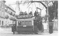The Vevey–Montreux–Chillon tramway was opened in 1888, and was the first electric tramway in Switzerland. It used an early electrification method, with twin overhead copper tubes carrying both polarities. The current was collected by a trolley running on these tubes, and pulled by the tramcar. The cars were double-deck, with an open upper deck.[2][3]