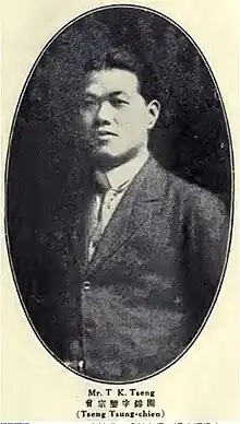 Tseng Tsung-chien Tsen Tsung-kien T. K. Tseng (born 1881 in Minhou, Fujian, died in 1958 in the United States). *In 1901 he took his first degree at Nanyang College in Shanghai and was sent to England. *From 1901 to 1907 he studied at King's College after which he studied at Pembroke College at Cambridge University. *From 1911 to 1912, during the Xinhai Revolution he was secretary of the Duan Qirui. *Till 1917 he was employed in the Foreign Ministry in Beijing. *From 1926 to 1929 he was Consul General in Australia and Minister of Sweden and Norway.[3]