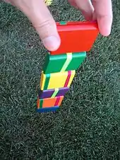 The simple toy ... is very illusive in action. When the upper block is grasped by the edges ... and turned so as to lift the second block in the series to the same height, the upper end of the second block falls into an inverted position, and appears to pass downward on the other members of the series, first upon one side of the ladder and then upon the other until it reaches the bottom. But this effect is only apparent, as the second block in reality only falls back into its original position in the series; but in the operation it becomes reversed, what was before the lower end becoming the upper end, the front having exchanged places with the back. This change of position of the second member brings it parallel with the third block, which is then released, and the third member drops over onto the fourth, when the fifth block is released, and so on throughout the entire series.