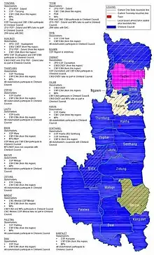 The Chinland Council, composed of 27 CNF members, 14 MPs and 68 members of local administrations, received the support of 14 of the 17 recognized local administration organizations in Chin State, with the exception of Falam, Tedim and Mindat.[3]