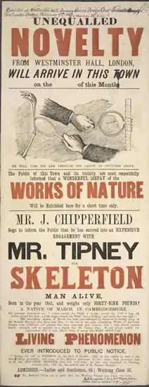 James William Chipperfield (1799 or 1803?–1866) grew up in his father's touring show. He was an assistant to Hamlin the conjuror. James married Harriet Amy Coan (4 December 1799-~1866) in Bury St Edmunds and had four children William James (1822– ), James William (1824–1913), Tom and Mary Phoebe (1826– ). James and Harriet tour with their own show in a horse drawn canvas wagon. Harriet died of pneumonia in 1841 at a fair in Rayleigh, Essex. Later James remarried and continued to tour with an even larger show. He retired and died in 1866. James William married Elizabeth Jones, their children continued the Circus tour.[11][12]