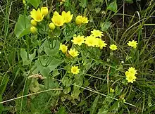 Yellow-wort grows 10–50 cm (3.9–19.7 in) tall, with stiff, branching stems. The leaves are glaucous, opposite and entire, the upper ones perfoliate, being united at the base. It bears terminal cymes of bright yellow, stalked flowers, 1–1.5 cm (0.39–0.59 in) across. The calyx is deeply divided into 6–10 linear lobes or sepals, spirally arranged, free or nearly free from each other at the base and shorter than the corolla. The petals number six to ten and form a short tube. There are six to ten adherent stamens and a two-lobed stigma.[2]