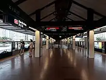 On 31 October 2012, the Land Transport Authority (LTA) announced that Choa Chu Kang LRT station will have two more platforms, specifically for commuters to exit the trains to allow the existing platform in the centre to have more space to cater to boarding passengers. There will also be additional fare gates and a new covered linkway from the LRT station to Lot One. These new additions which also include widening the staircase between the MRT and the LRT stations were completed in 2016. New Exit E was opened at the same time, to Lot One Shoppers Mall but despite that, there is no lift access, only stairs.[9] The two newly constructed platforms at the LRT station began operations on 27 December that year. The two new side platforms, platforms 3 and 4, lack lift access so passengers who needs to take the lift when alighting at Choa Chu Kang LRT station have to wait for the doors to open to the island platform (platforms 1 and 2), where lift access is available. Stickers to remind passengers to exit at platforms 1 or 2 if they need a lift to exit are placed on all the LRT doors.[10]