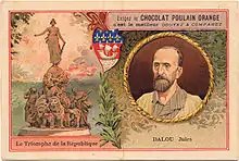 Victor-Auguste Poulain began the mass production of chocolate in 1848 in Blois, France,[2][1] before forming a limited company in 1893. He believed that a commercial future in chocolate would be found by selling to the masses and was innovative in industrialising the production of chocolate and in widespread marketing campaigns targeting children and families. In 1975, Chocolat Poulain was the sponsor of the mountains classification in the Tour de France when its distinctive polka jersey was introduced; the jersey's design was based on the jersey of the pre-War cyclist Henri Lemoine and later, due to its popularity, the design was adopted for wrapping of their chocolate bars.[3][4]