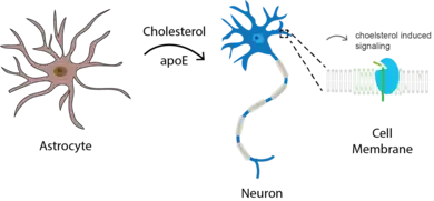 Cholesterol signaling (brain); Astrocyte cholesterol is exported to the neuron where it causes clustering of lipids. Clustering activates enzymes and other proteins by substrate presentation.[6]