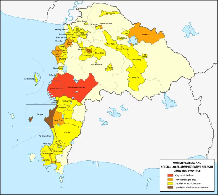 Chonburi province, with a registered population as of 31 December 2019 of 1,558,301, is led by a governor and is divided into 11 districts (amphoe).[1] Each district is led by a district chief (nai amphoe). Governor, district chiefs, and district clerks are appointed by the central government. There are 92 subdistricts (tambon), each led by a subdistrict chief (kamnan); these are further divided into 711 villages (muban), each led by a village chief (phu yai ban). Subdistrict chiefs and village chiefs are elected by local citizens.[2]