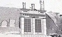 Sometime in the Christian period a church was installed in the cave dedicated to Panaghia Spiliotissa. Lord Elgin removed the Hellenistic statue of Dionysos[6] in 1802 as a part of the Elgin Marbles; thus the sculpture was spared when the monument was destroyed by an Ottoman bombardment during the siege of Athens in 1827. Although the monument was scheduled to be restored in the nineteenth century by the Athens Archaeological Society, some of the marble was recarved and reused on the Byzantine church of Soteira Lykodimou. Recent restoration work began in 2002 and draws largely on the measured drawing by Stuart and Revett undertaken in the eighteenth century.[7] It was through the work of Stuart and Revett and J. D. Le Roy's Ruines des plus beaux monuments de la Grece (1758) that the Thrasyllos Monument would influence later architecture. Both Karl Friedrich Schinkel and Alexander Thomson adopted the post-and-lintel construction of the monument in their work.[8]