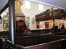 Nikolaus Pevsner considers the chapel "has the best-preserved C18 ecclesiastical interior in South Lancashire".[8] The original box pews are in place upstairs and down, there is a three tier pulpit on the north wall. The galleries on the east, south and west sides are accessed by staircases with turned balusters. The galleries are supported by six turned Doric oak columns which continue through the gallery to support the plaster ceiling.[8] A nail studded oak door separating the chapel from the vestry is thought to be from the original 1645 chapel.[2][9] Other surviving artefacts brought from the 1645 building are the communion table and two Commonwealth silver communion cups gifted by Robert Mort in 1654.[9] The cups are not kept at the chapel and are rarely displayed. Some of the stained glass windows are by Shrigley and Hunt.[8]