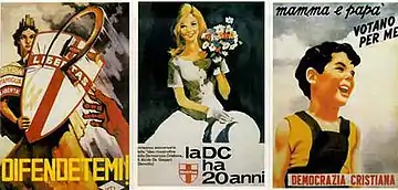 The Christian Democracy party was opposed to both Fascism and Communism. In elections Italians were voting based on a way of life, not just a political party.[13] Christian ideals were usually paired with the idea of freedom.[14][15]